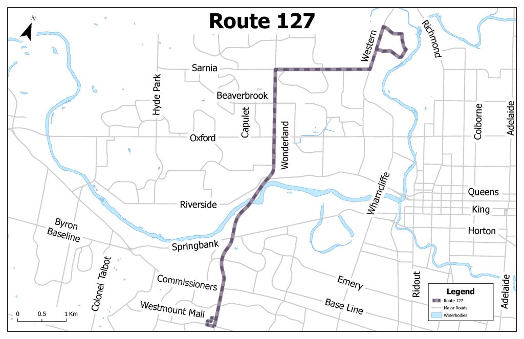 After the implementation of the 2025 service plan, which saw the modificaiton of Route 10 to travel north on Wonderland north of Sarnia Road to Fanshawe Park Road, terminating at Masonville, concerns were raised with regards to the loss of direct, one bus service between Westmount Mall and Western.  To address these concerns, the Commission approved the extension of Route 127 to Westmount Mall, operating on reduced frequencies of between 17 and 60 minutes depending on time period.